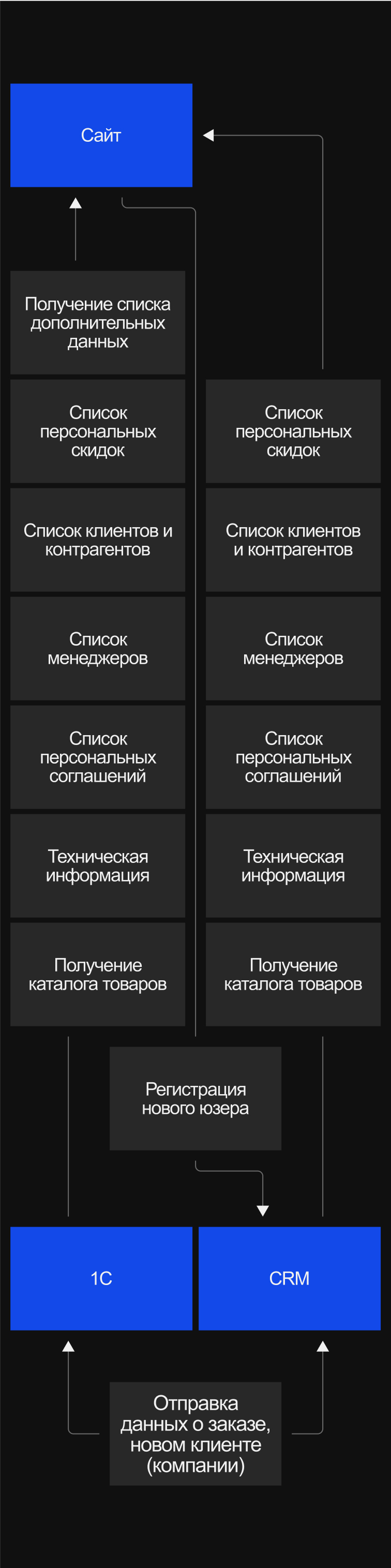 Клиент захотел, чтобы сайт был разработан на «1С-Битрикс: Управление сайтом». Реализовали систему, построенную на трёхсторонней связи: сайт интегрирован с CRM и 1С, где 1С выступает в качестве системы хранения информации о товарах, соглашений пользователей и прочих важных данных.