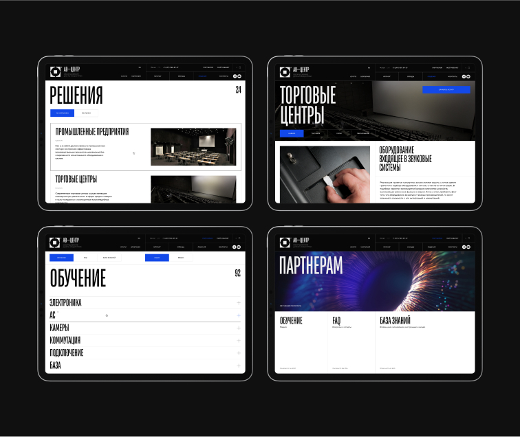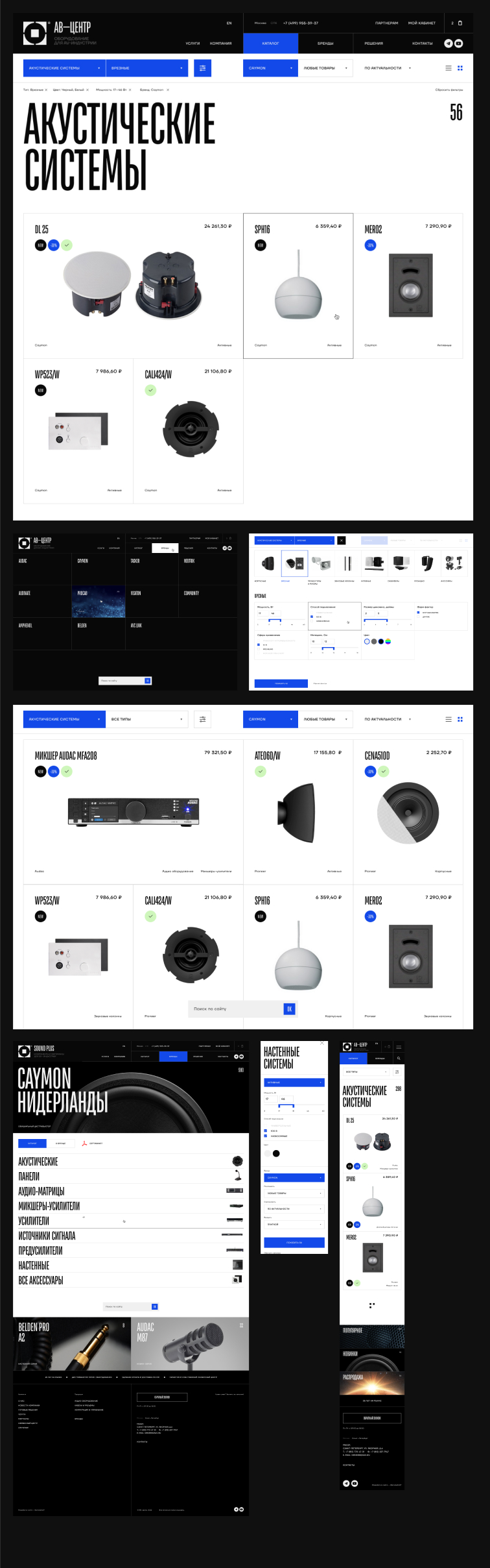 Чтобы поймать настроение и ассоциацию бренда, изучили документацию и чертежи продукции компании: акустических систем, матриц и микрофонов. Также мы ориентировались на то, что важно сохранить простоту и функциональность сайта. Поэтому выбрали лаконичную типографику, добавили прямые линии, разделители и геометрию.