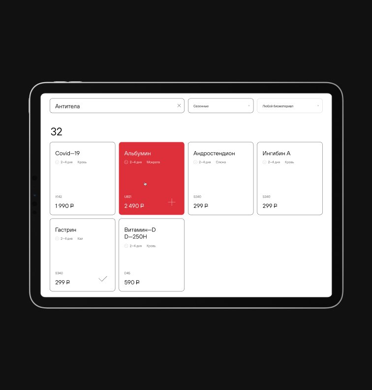 Проработали удобный и понятный каталог. Все исследования разбили по карточкам-группам, например, «Иммунитет», «Ковид», «Инфекции».