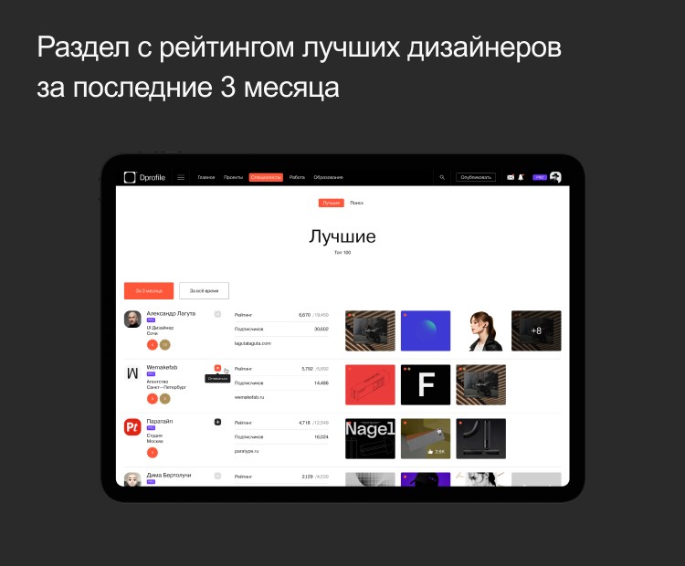 Мы добавили второй вид рейтинга, который показывает самых активных дизайнеров на площадке за последние 3 месяца. И сделали, чтобы этот вид рейтинга показывался по умолчанию. Так у молодых и талантливых специалистов появилась возможность стать выше самых опытных «старичков» в рейтинге.