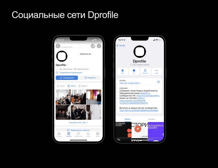 За полгода до релиза Dprofile мы завели канал в «Телеграме»и паблик во «ВКонтакте» . В них публиковали посты о целях и планах по развитию площадки. Сейчас в соцсетях публикуем актуальные новости о Dprofile, его функционале и сообществе, даём советы, как правильно взаимодействовать с площадкой, и анонсируем мероприятия.