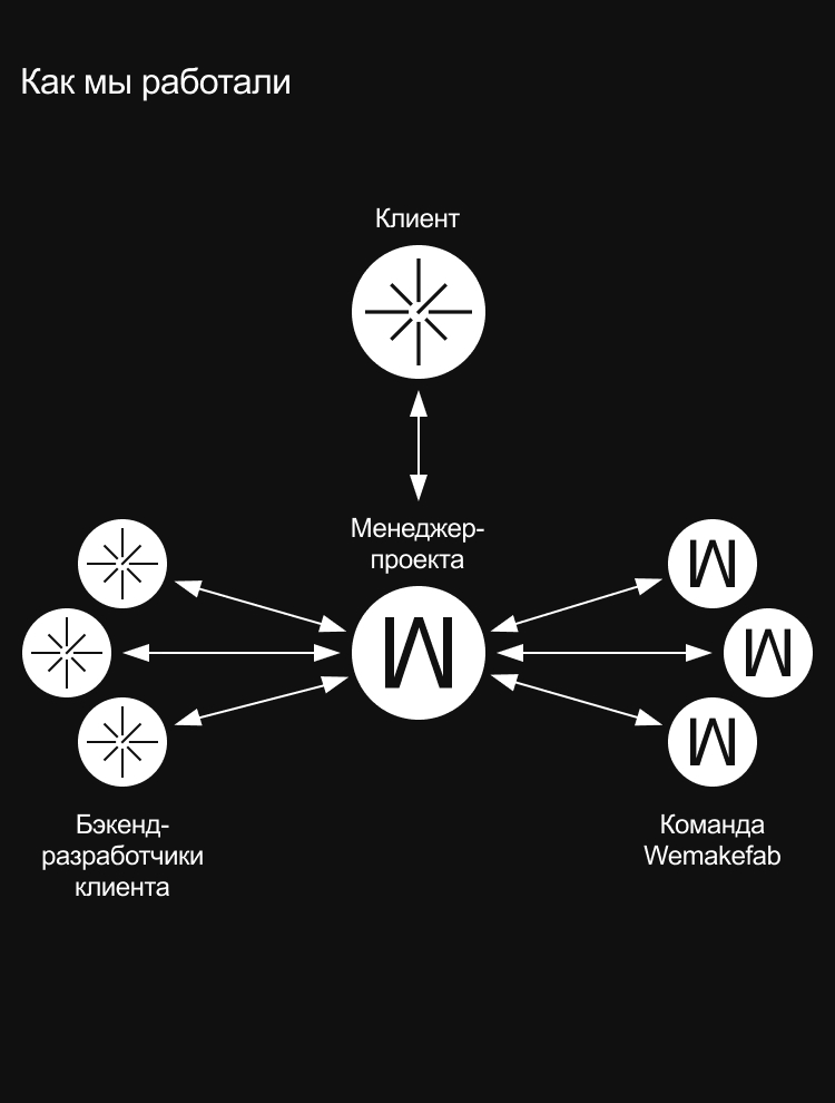Специалисты заказчика отвечали за конфиденциальные данные в части бэкенда сервиса. Наш проджект-менеджер интегрировался в их in-house команду. Так мы смогли синхронизировать работу сотрудников клиента и работу наших специалистов: дизайнеров, фронтенд- и бэкенд-разработчиков. Это помогло не выбиваться из плана работ и сдать проект в срок.