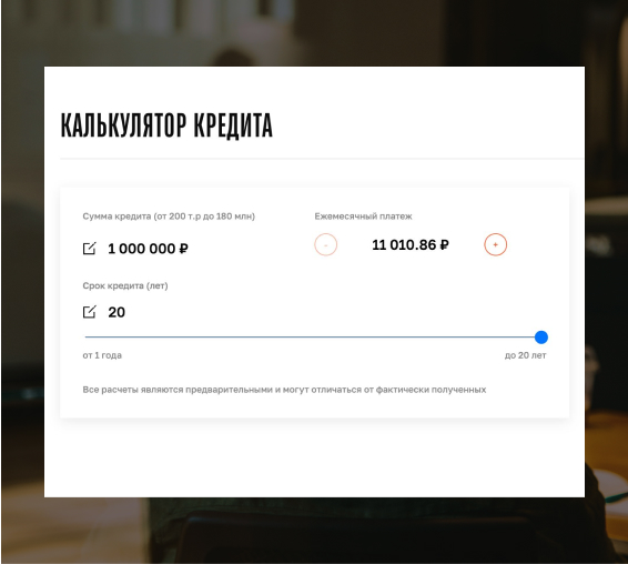Калькулятор — один из самых сложных и интересных элементов нового сайта. Самым сложным было интегрировать формулы расчёта платежей из Excel в JavaScript. Мы протестировали несколько библиотек, чтобы найти оптимальное решение, и настроили формулу так, чтобы она корректно работала на сайте.
