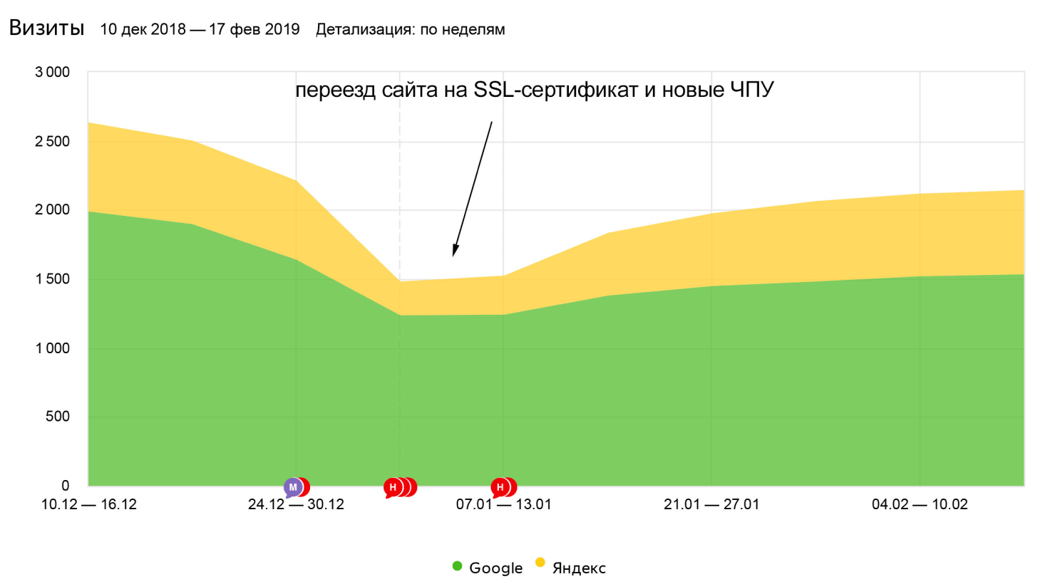 Помочь тут мог только переезд сайта на безопасный протокол. Мы запланировали его аккурат перед началом новогодних праздников. Так естественная просадка по органическому трафику стала едва заметной для отдела продаж компании.