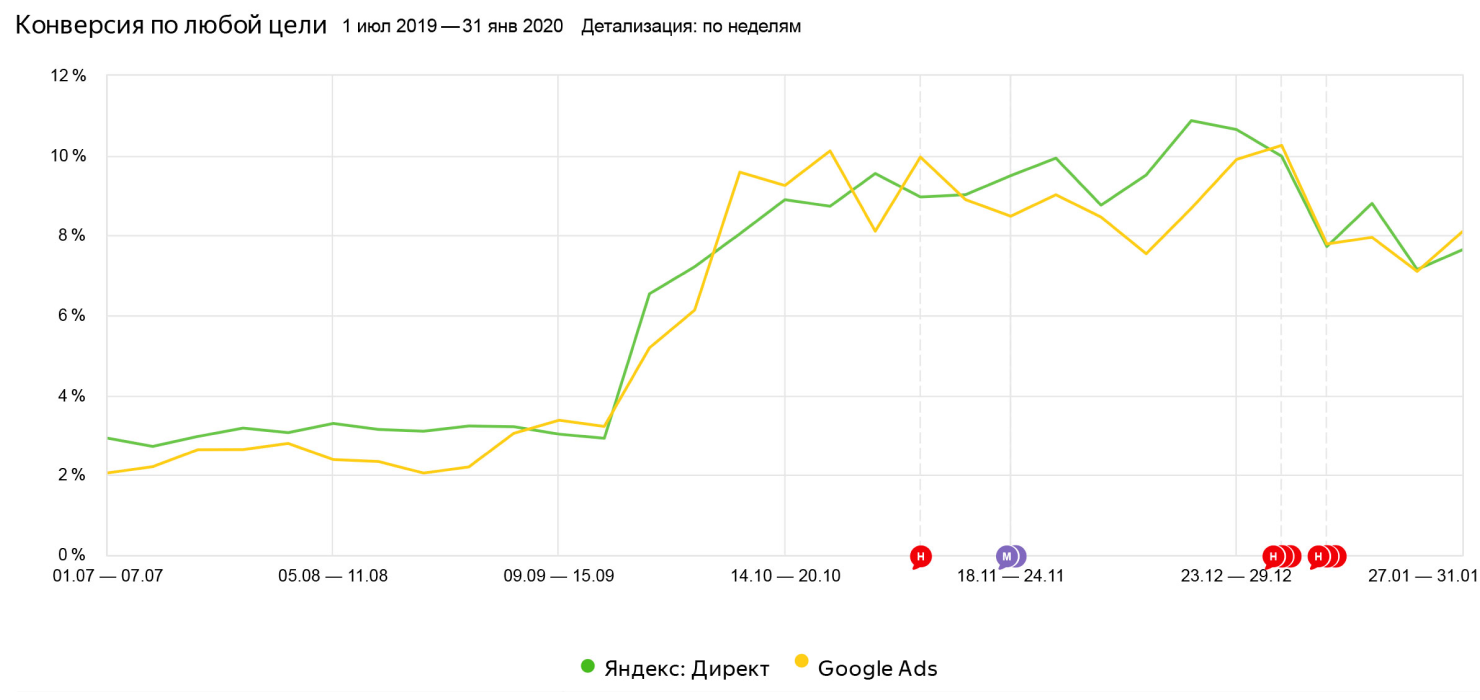 Нам удалось в 2,5 раза увеличить конверсионные показатели по PPC-источникам, сдержав рост стоимости одного обращения.