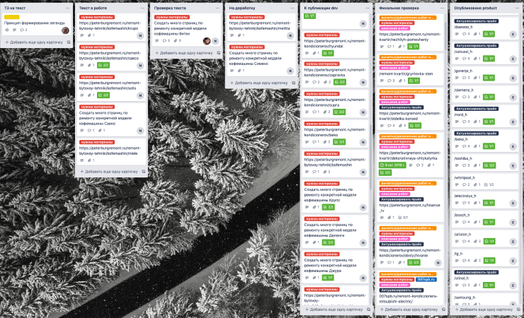 В тематике ремонтных услуг главный фактор для успешного продвижения сайта — это качество контента и скорость его согласования заказчиком. У компании более 3000 продвигаемых услуг и столько же посадочных страниц. Конкуренция жёсткая. Клиенты требовательные. Поэтому содержание страниц нужно регулярно оптимизировать.