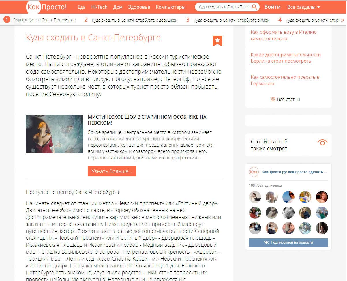 Например, «куда сходить с девушкой в спб» или «куда сходить в Питере в дождь» и т.д. Это были информационные статьи, зачастую с внутренними рекомендациями от редактора и рейтингом мест. Упоминание нашего проекта в таких статьях позволило бы кратно увеличить узнаваемость и доверие среди пользователей.