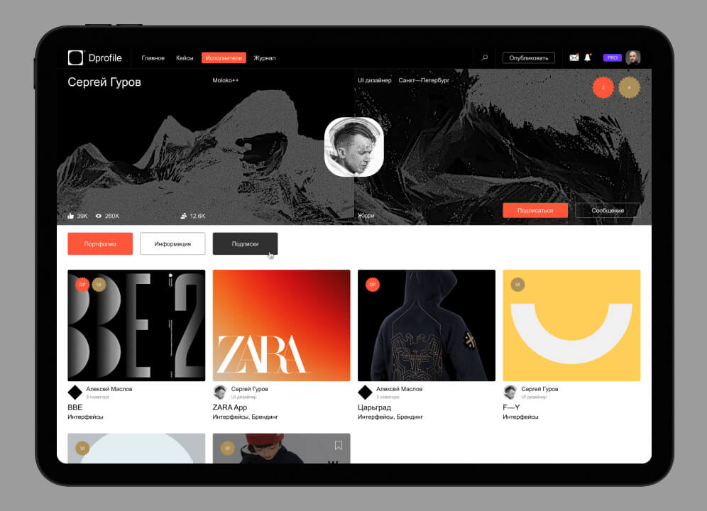 Dprofile — единый профиль дизайнера для поиска заказчиков, построения карьеры, обучения и заработка. Основной функционал строится вокруг портфолио и умной ленты рекомендаций. Также можно будет автоматически выгрузить свои работы с Behance.