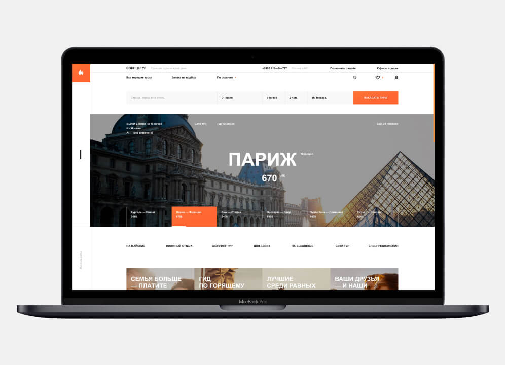 Мы сделали полноценный дизайн, который включает в себя поиск туров, личный кабинет, информацию для клиентов, разделы посвященные франшизе и много других вкуснях.